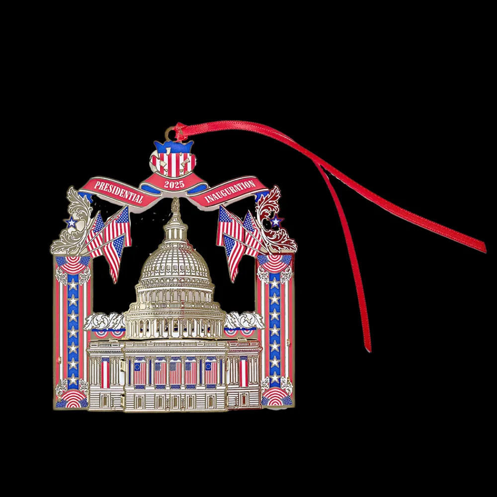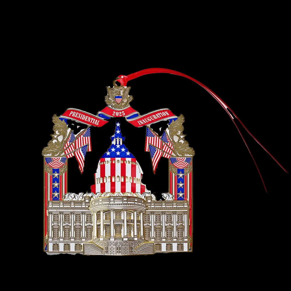 Commemorate the 60th Presidential Inauguration in 2025 with this USA made, brass ornament finished with 24K gold. Exceptionally detailed, etched designs depict a South Portico view of the White House on one side and the West Front of the U.S. Capitol Building on the opposite side. Adorned with USA flags and stars, this ornament also features headline text “2025 Presidential Inauguration”.