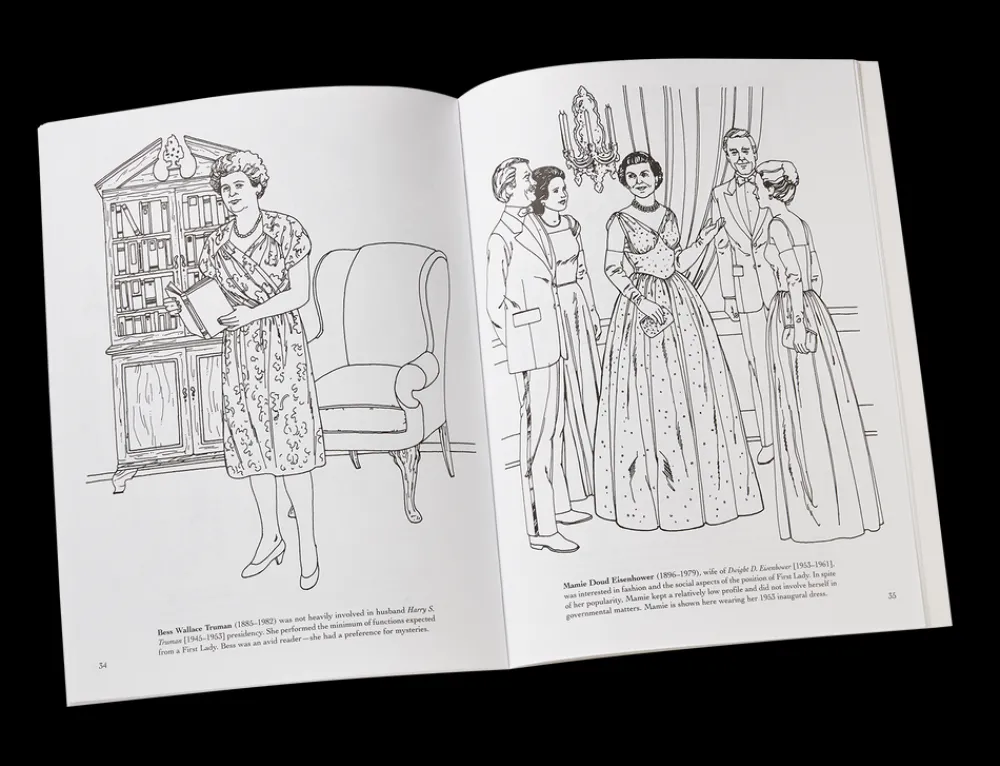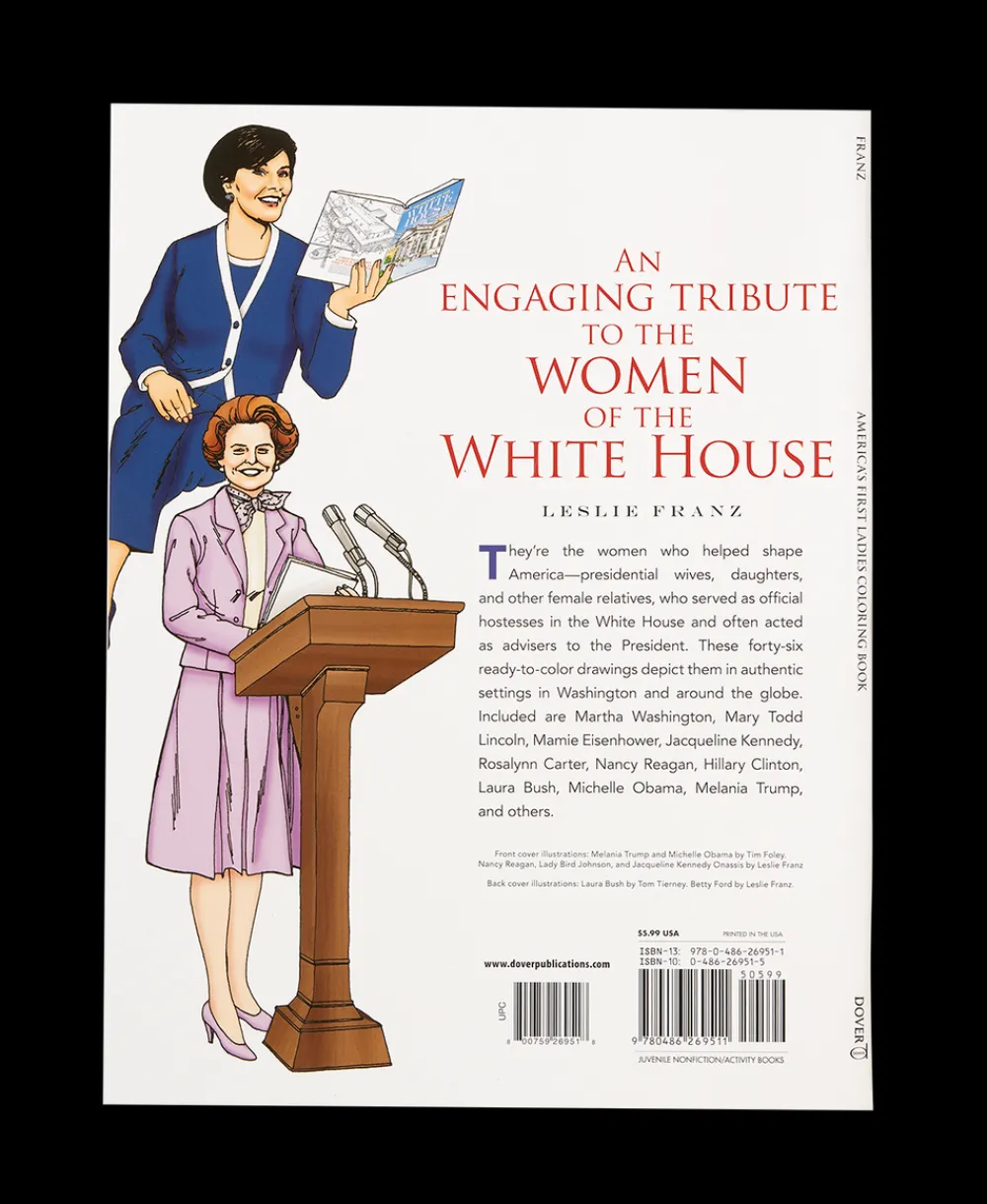 These 44 ready-to-color drawings depict first ladies from Martha Washington to Michelle Obama in authentic settings in Washington and around the globe.