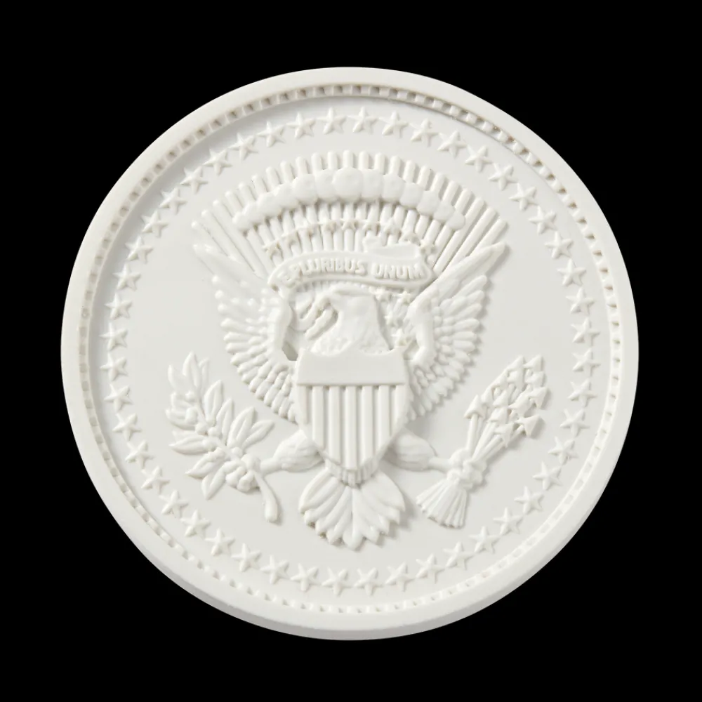 The Aquia, Virginia, sandstone that makes up the exterior walls, embellishments, and window surrounds of the White House was was also used to create this challenge coin.