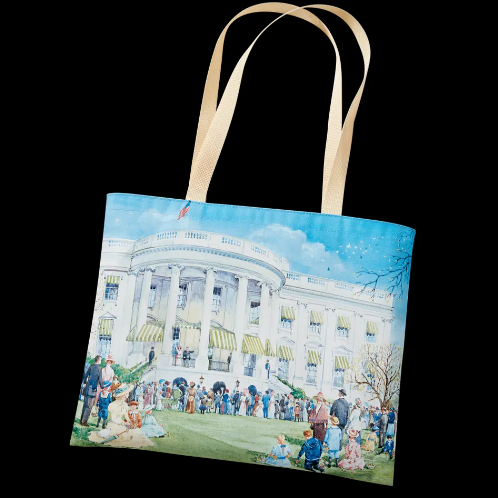 This tote features a painting by Home Hacker of President William Howard Taft and First Lady Helen Taft wave to the Easter Monday throng at the annual White House Easter Egg Roll in 1909. Family fun and egg rolling have surrounded this public event at the White House since 1878.