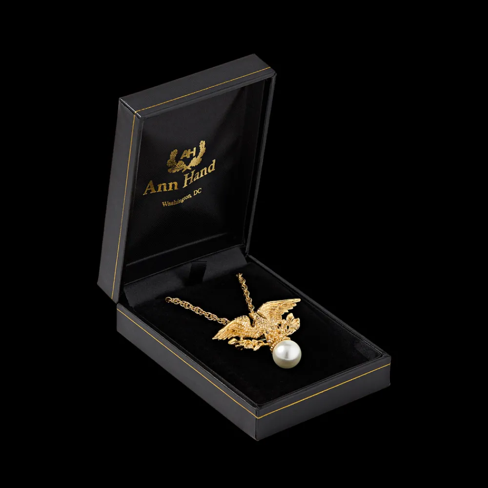 The stately pin and pendant is a versatile piece that celebrates the symbolism of the American Bald Eagle. This piece soars whether adorning a jacket or worn with the accompanying 22″ chain as an evening necklace. Gold plate over pewter featuring a lobster clasp.