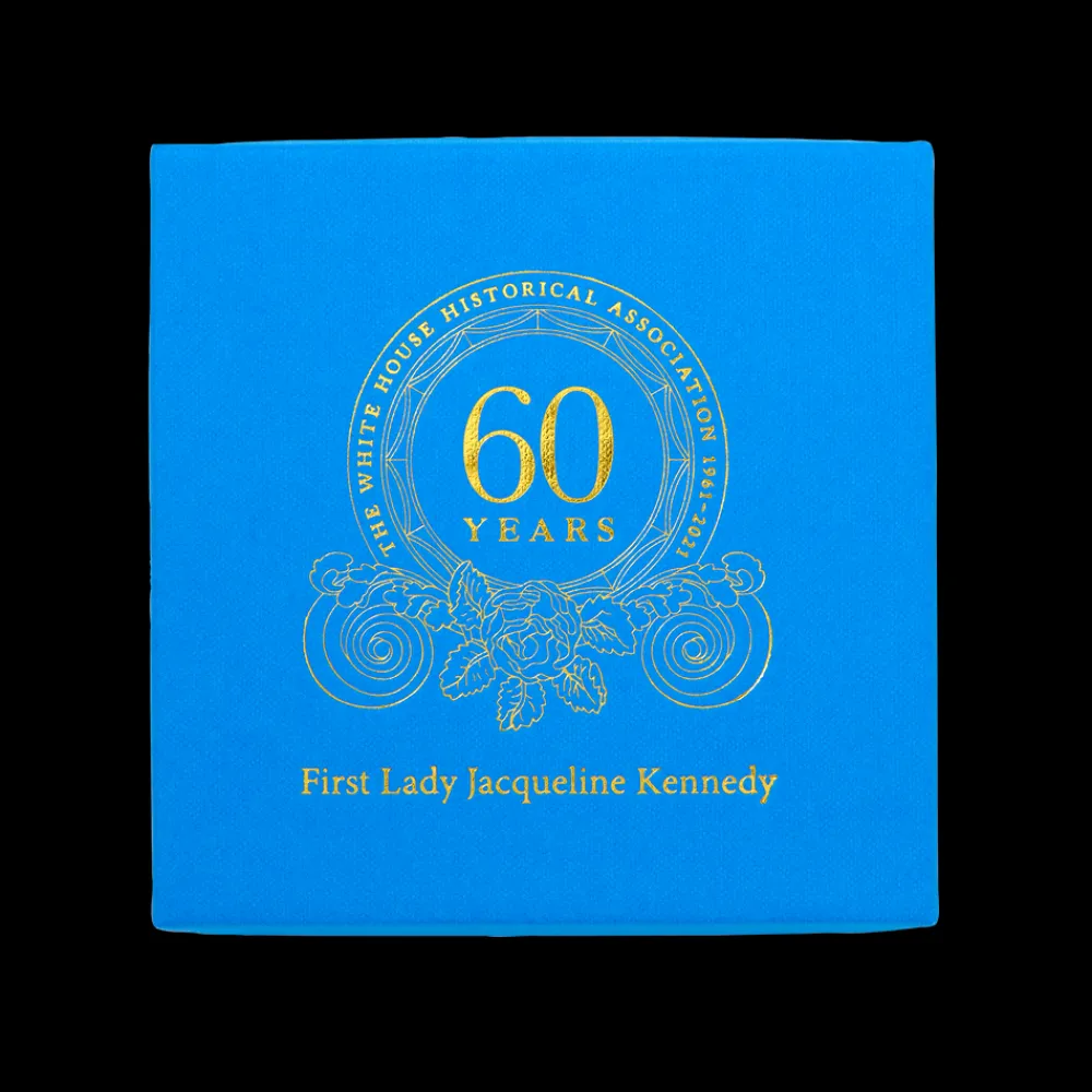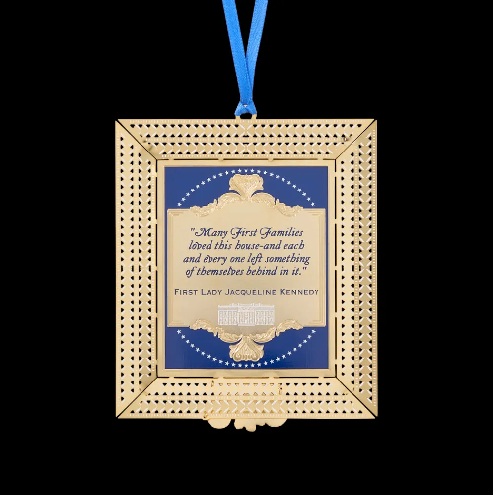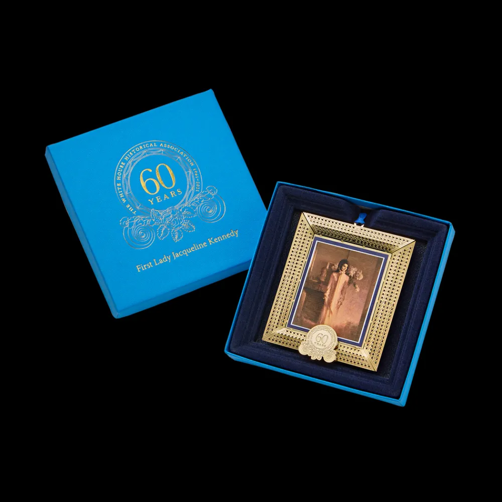 On February 23, 1961, First Lady Jacqueline Kennedy launched the most celebrated redecoration of the White House in its history, undertaking an ambitious plan to acquire the finest period furniture, with which the historical integrity of the Executive Mansion’s interiors would be restored. Recalling a disappointing childhood tour with little history to impress her, she was determined to make her new home “the most perfect house in the United States.” Within a year, a committee was formed, a law passed, donations sought, a nonprofit chartered, and a museum-quality collection of historic furnishings established. Mrs. Kennedy’s time in the White House, however, was abruptly cut short on November 22, 1963, with the assassination of her husband President John F. Kennedy. Jacqueline Kennedy returned to the White House only once after departing through the East Garden on December 6, 1963. During a private visit in 1971, she would view her official portrait by Aaron Shikler, which is featured on this ornament. While the portrait preserves her likeness for posterity, her transformational vision for the White House, so masterfully executed in barely one thousand days, is preserved in the fabric of the historic interiors and through the work that has been carried on by the White House Historical Association, the private nonprofit partner she founded. Incorporated on November 3, 1961, to enhance the public’s “understanding, appreciation, and enjoyment of the historic White House,” the Association continues to share and preserve the history of the White House with ever evolving and expanding initiatives. As the steward of the living legacy of the Kennedy restoration, the Association not only looks ahead but embraces the past.