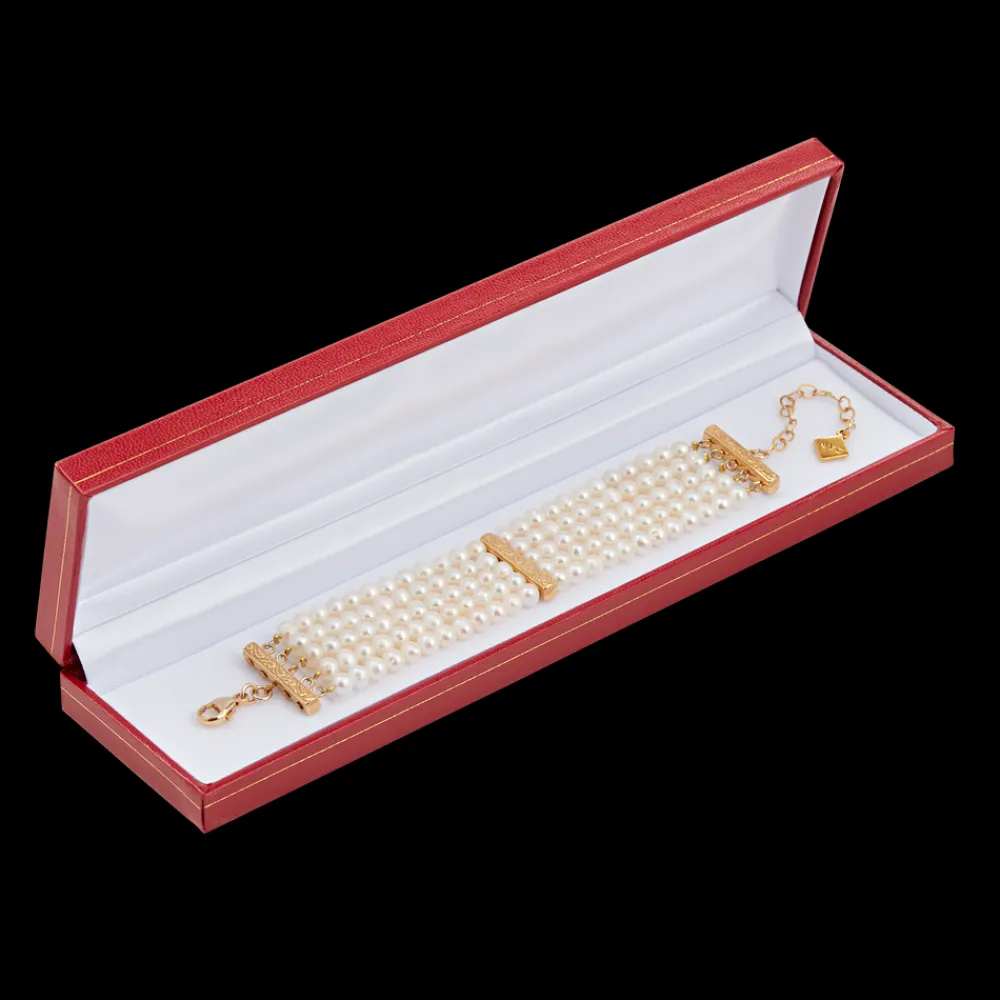 The First Lady Nancy Reagan jewelry collection is inspired by the striking pearl choker worn by Mrs. Reagan in her official portrait by Aaron Shikler. Born in New York City, Nancy Reagan studied theater at Smith College and pursued a successful career performing on Broadway and in motion pictures. She met Ronald Reagan in 1951, and retired from making movies soon after their marriage in order to devote herself to the roles of wife and mother. As first lady from 1981 to 1989, Mrs. Reagan was an advocate for the arts and focused much of her energy on combatting the problems of drug abuse in the nation. This jewelry is made of cultured pearls and comes in a beautiful gift box that measures 8 1/2” x 2” x 1″.