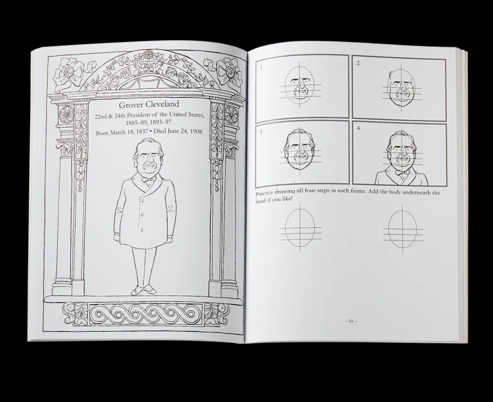The presidents of the United States of America have always been a popular subject for American artists. Official presidential portraits line the walls of the White House, reminding all of their esteemed subjects. The first artist to have the honor of creating an official presidential portrait was Gilbert Stuart, whose famous painting of President George Washington is one of the most treasured pieces in the White House Collection. In this unique and fun new book, the award-winning illustrator John Hutton offers step-by-step lessons for aspiring artists of all ages to draw the presidents. Dr. Hutton begins by explaining that, “Anyone can learn to draw. Drawing is simply another form of looking. . . . The trick is in learning to look very carefully, and to know what to look carefully for. Drawing is translating the world into a pattern of lines and tone. With each new line drawn a shape takes form, and before you know it, you have a complete drawing!” With Hutton’s step-by-step instructions, you can try drawing each president right on the page of the book, looking to the facing page for guidance. This book is original and, as a presidential primer, quite fun. There has never been a book like it.