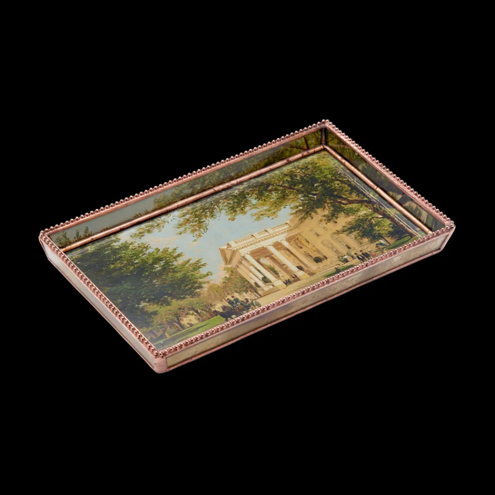 Small glass decoupage tray depicting a painting of the north side of the White House in 1914 by artist John Ross Key.