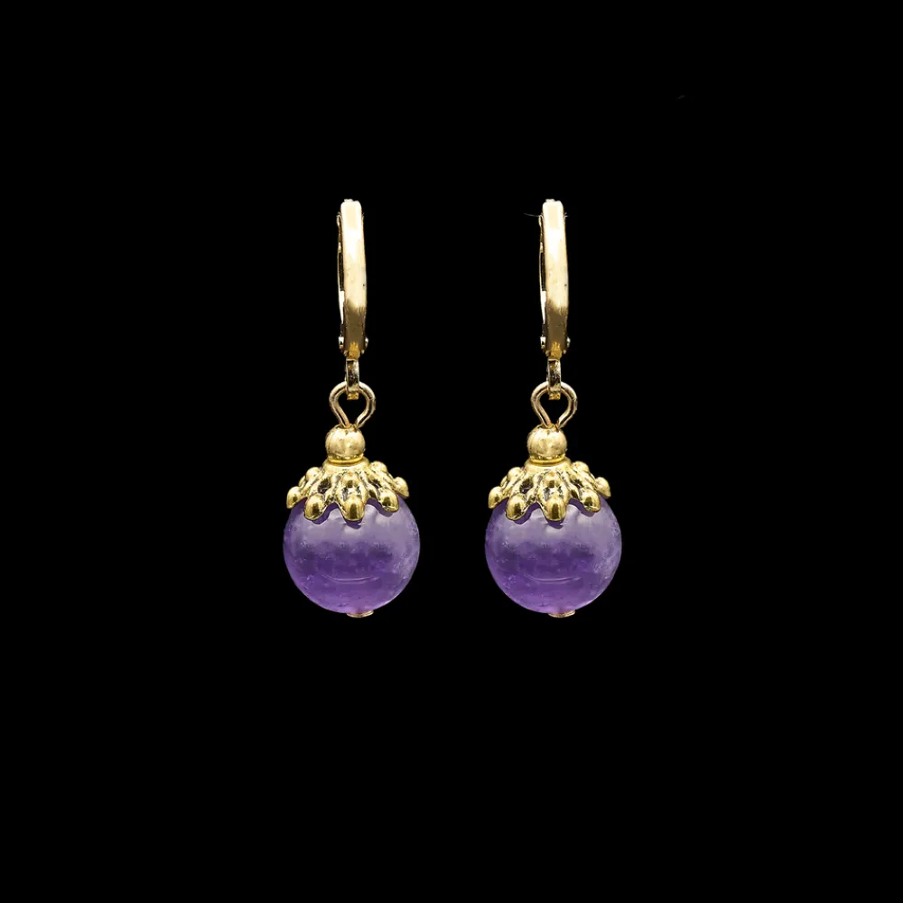 The “huggie” earring is a trendsetting and popular earring silhouette. These purple amethyst 10mm bead huggie earrings are 1 1/4-inch in length and hug the ear perfectly for a comfortable and eye catching pop of color. The 18-karat gold accents add a touch of elegance to any outfit.