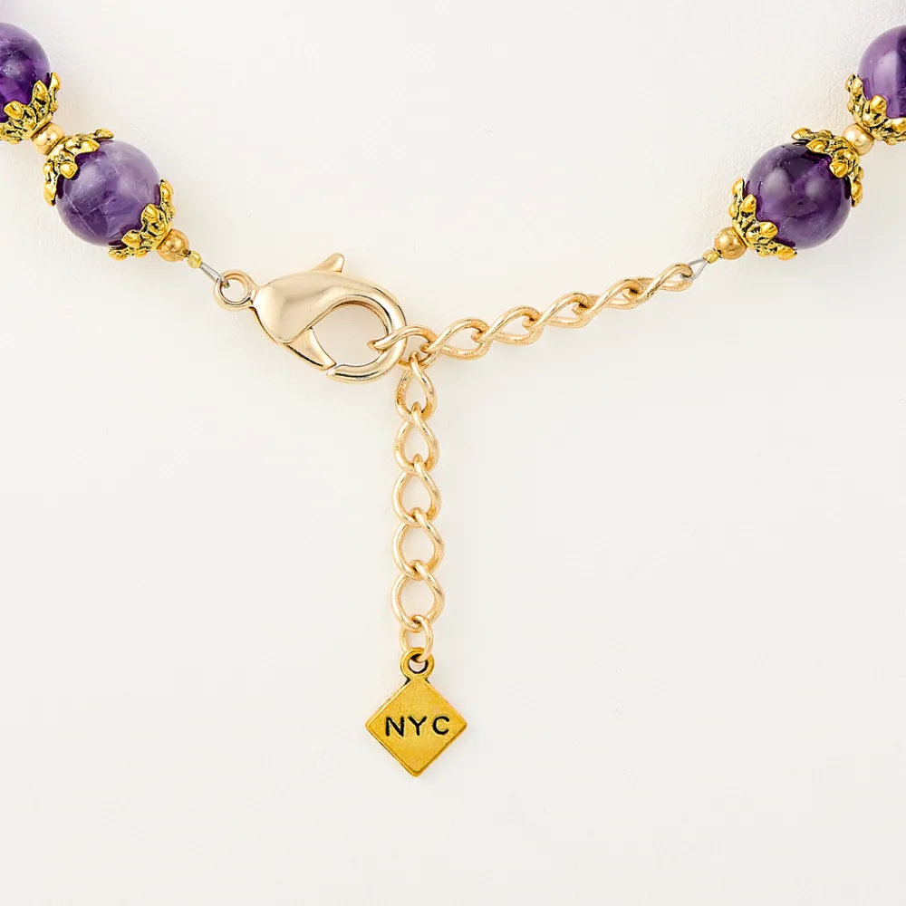 Elevate your jewelry collection with our stunning purple Amethyst Bead 16-inch necklace with gold accents. Crafted with exquisite 10mm amethyst stone beads and adorned with an ornate antiqued bead caps, this necklace evokes the quiet luxury and elegance of the Lincoln Presidential china collection itself. Perfect for adding a touch of sophistication to any outfit. Length is adjustable for an additional 2-inches length for best fit. Lobster clasp closure.