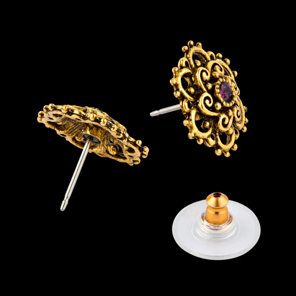 Finely crafted and elegantly designed, these antiqued gold openwork earrings feature a faceted purple crystal at its center. Made from gold-plated pewter, these 1/2-inch diameter post earrings have a subtle profile that is sure to add a touch of sophistication to any look.