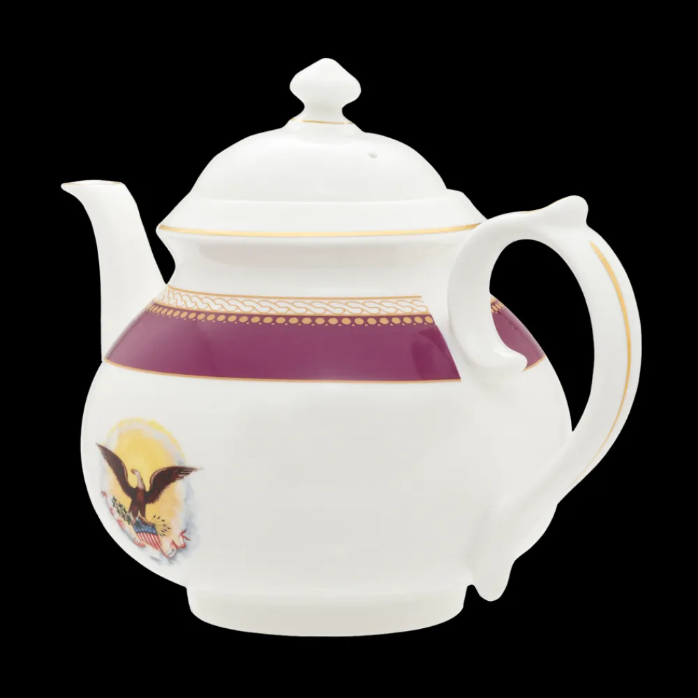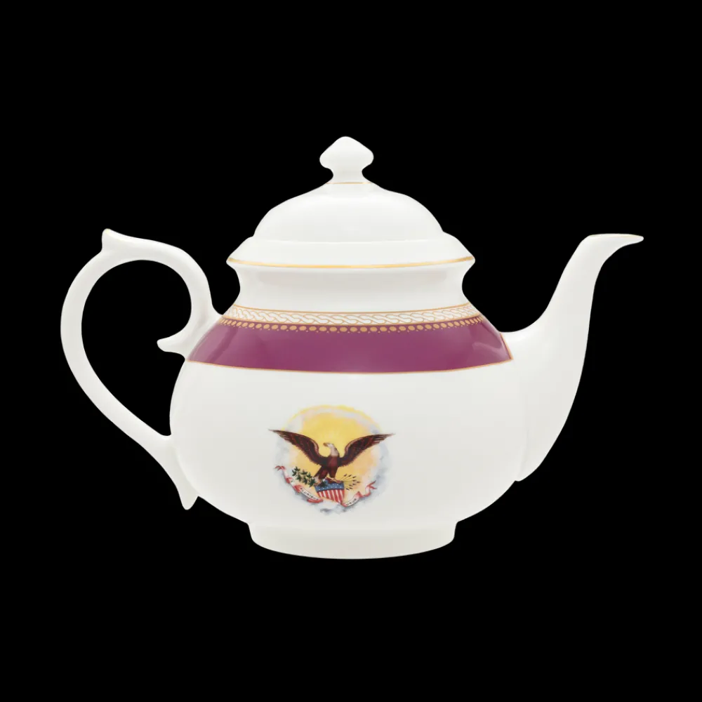 Produced exclusively for The White House Historical Association by Halcyon Days, the Lincoln Collection is inspired by President and Mrs. Abraham Lincoln’s White House china service. The porcelain dinner, breakfast, dessert, and tea service was purchased for the White House by First Lady Mary Todd Lincoln during an 1861 shopping trip to the E. V. Haughwout & Co. department store in New York City. The itemized bill included with Mrs. Lincoln’s new china includes the following description of her purchase, “One fine Porcelain Dining Service . . . decorated Royal purple, and double gilt, with the Arms of the United States, on each piece.” The beautiful state service, which originally included 190 pieces, was reordered during the presidencies of Ulysses S. Grant and Chester A. Arthur and examples are kept on display in the White House China Room today. This elegant 6-cup tea pot ships in a beautiful giftbox and includes a descriptive insert about the collection. Suitable for making your perfect pot of tea or decorative display. Handwash only.