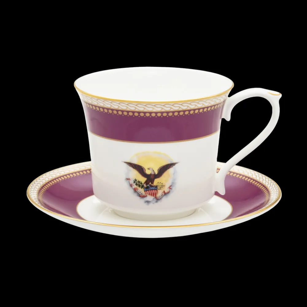 Produced exclusively for The White House Historical Association by Halcyon Days, the Lincoln Collection isinspired by President and Mrs. Abraham Lincoln’s White House china service. The porcelain dinner, breakfast, dessert, and tea service was purchased for the White House by First Lady Mary Todd Lincoln during an 1861 shopping trip to the E. V. Haughwout & Co. department store in New York City. The itemized bill included with Mrs. Lincoln’s new china includes the following description of her purchase, “One fine Porcelain Dining Service . . . decorated Royal purple, and double gilt, with the Arms of the United States, on each piece.” The beautiful state service, which originally included 190 pieces, was reordered during the presidencies of Ulysses S. Grant and Chester A. Arthur and examples are kept on display in the White House China Room today. This elegant tea cup and saucer ships in a beautiful giftbox and includes a descriptive insert about the collection. Handwash only.