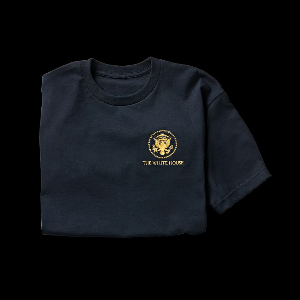 This unisex navy t-shirt features the Truman Seal and “The White House” embroidered in gold metallic thread.Machine wash cold, inside out with like colors. Only non-chlorine bleach when needed. Tumble dry medium, medium/hot iron. Do not iron decoration.