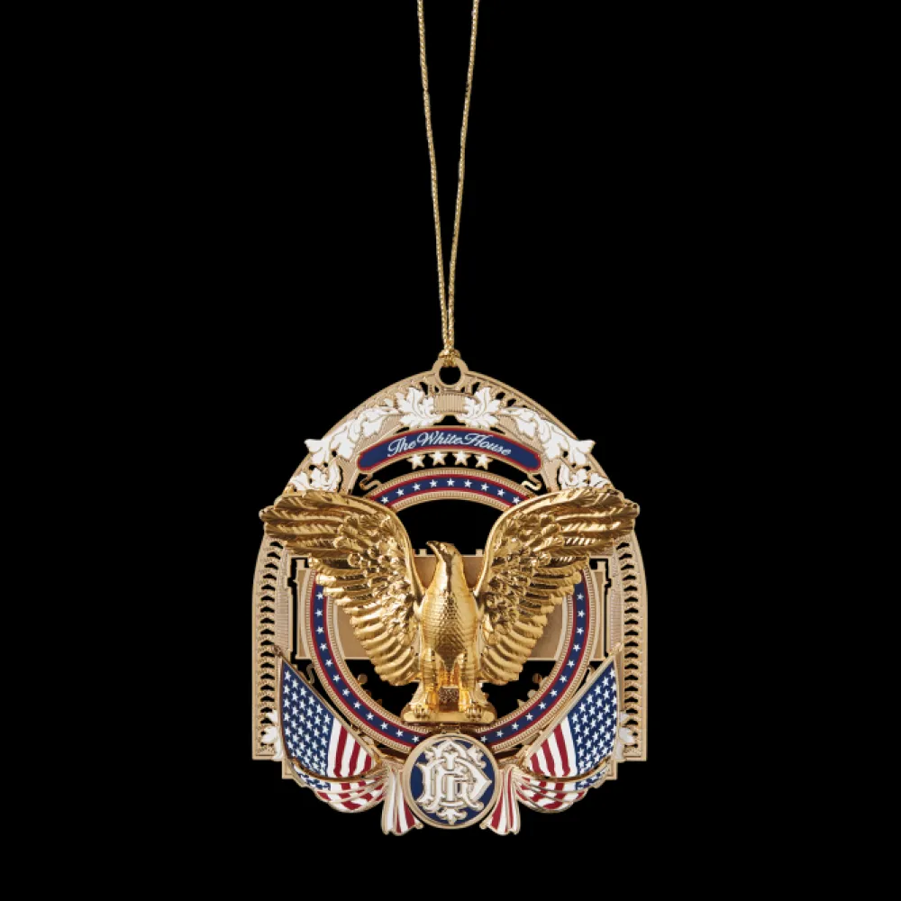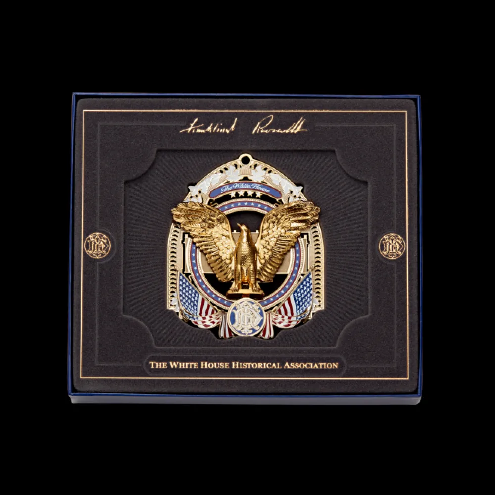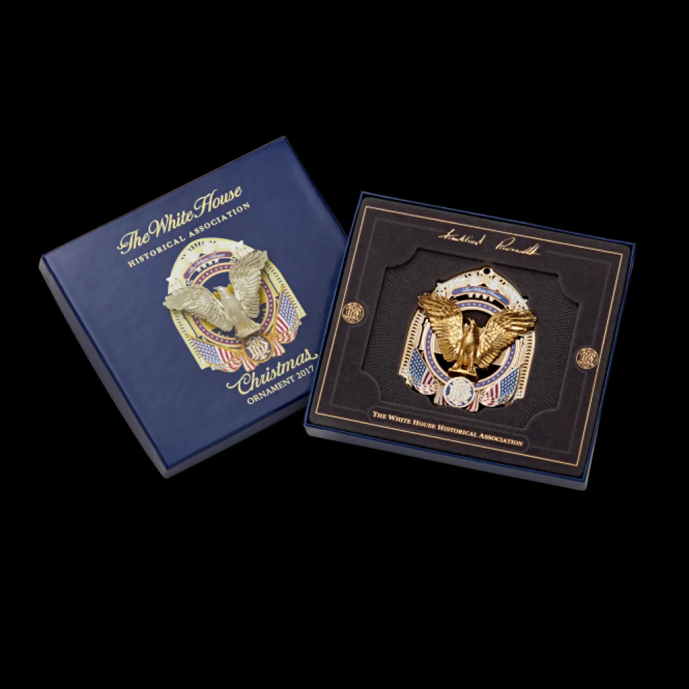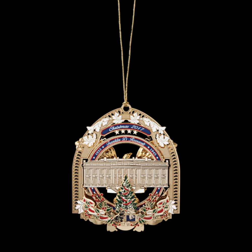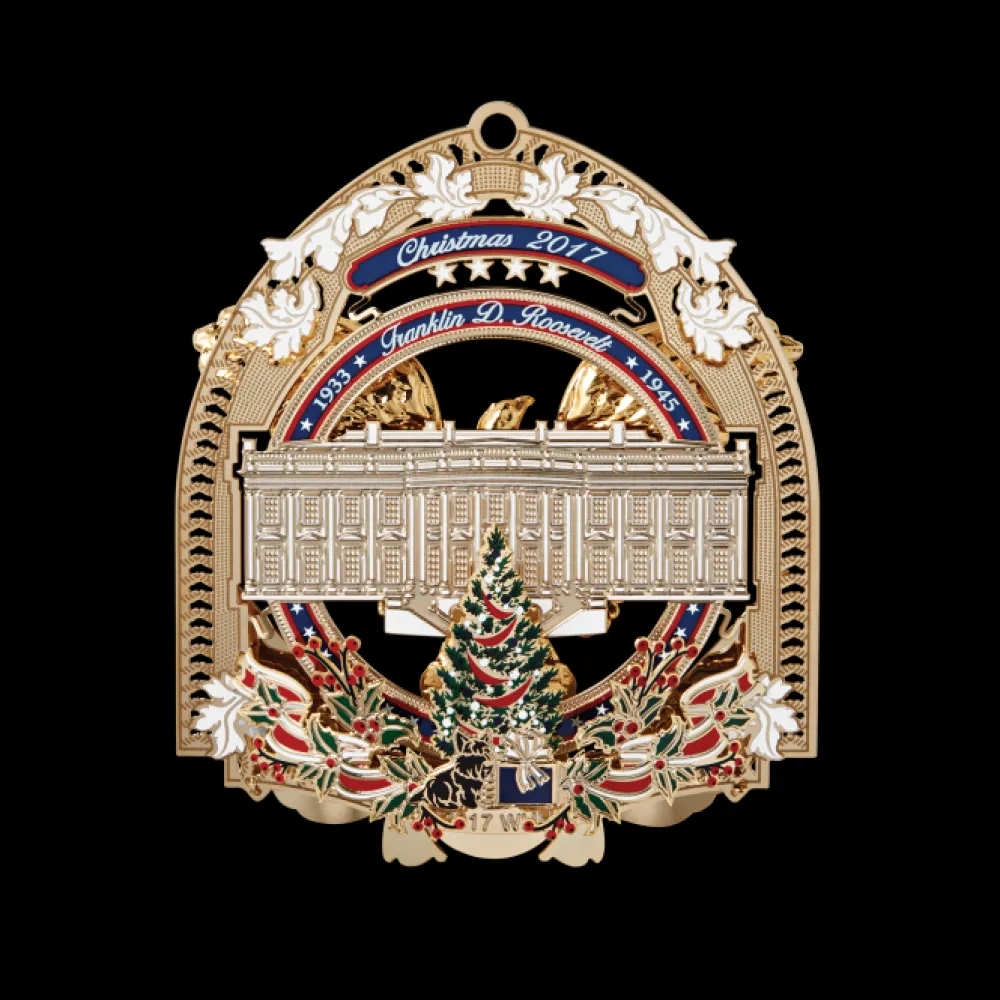 The Official 2017 White House Christmas ornament honors the administration of Franklin D. Roosevelt, who served as the thirty-second president of the United States from 1933 to 1945 and his remarkable journey to restore the faith of the American people. The ornament is crafted from shiny brass plated with nickel and 24-karat gold.