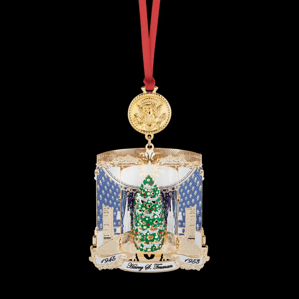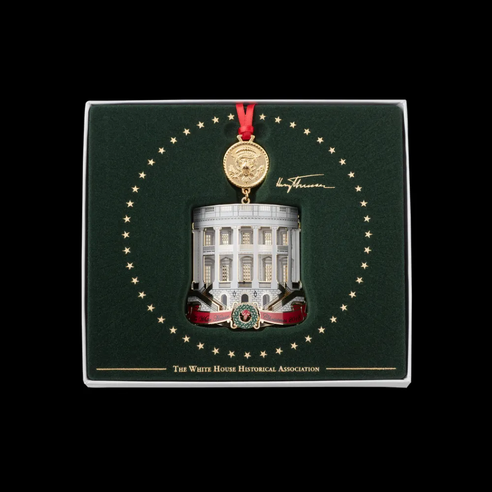 The White House Historical Association’s 2018 White House Christmas Ornament honors Harry S. Truman, the thirty-third president of the United States. This ornament is designed to illustrate three significant changes made by President Truman during his administration, one to the Presidential Seal, and two to the White House itself. One side of the ornament features his celebrated Truman Balcony, added in 1947–48 to the South Portico, and the other side features his renovated Blue Room, which, like all the rooms of the house, was dismantled and rebuilt during the renovation of 1948–52. These two images represent Truman’s White House alterations and restorations, the most extensive work on the house since President George Washington built it in the nation’s dawning and Presidents James Madison and James Monroe restored it after the fire in the War of 1812.