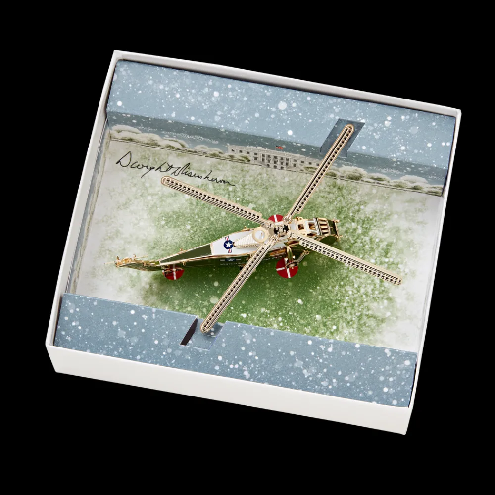 The White House Historical Association’s Official 2019 White House Christmas Ornament honors Dwight D. Eisenhower, the thirty-fourth president of the United States. This ornament symbolizes President Eisenhower’s commitment to innovation. Eisenhower was the first president to fly in a helicopter while in office in July 1957, and thereafter the helicopter became a feature of White House life. It was often used by the president to commute short distances, demonstrating to the public and indeed the world that it was safe.