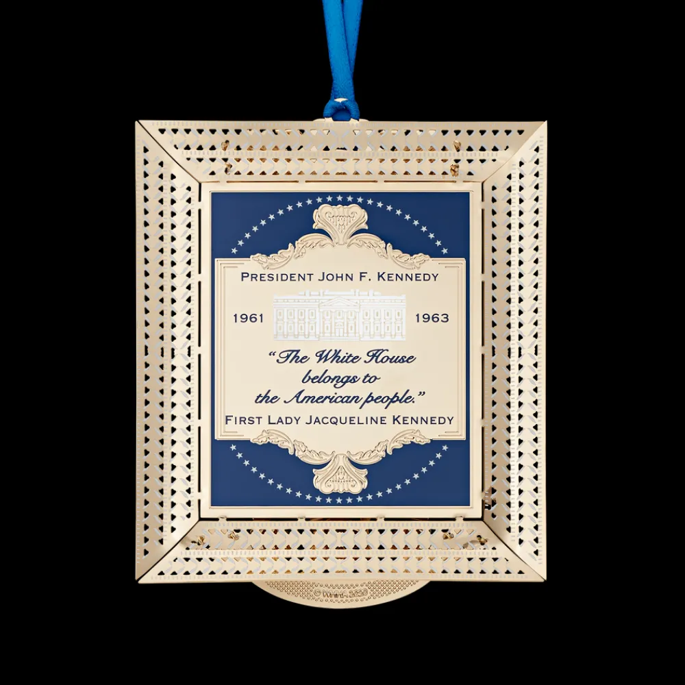 The White House Historical Association’s Official 2020 White House Christmas Ornament honors John Fitzgerald Kennedy, the thirty-fifth president of the United States. The youngest president since Theodore Roosevelt, Kennedy took office in January 1961, at age 43. Before his vibrant presidency was cut short by an assassin’s bullet on November 22, 1963, he had invigorated the American spirit. His legacy lives on in his youthful belief in America and his faith in America’s responsibilities to the world.