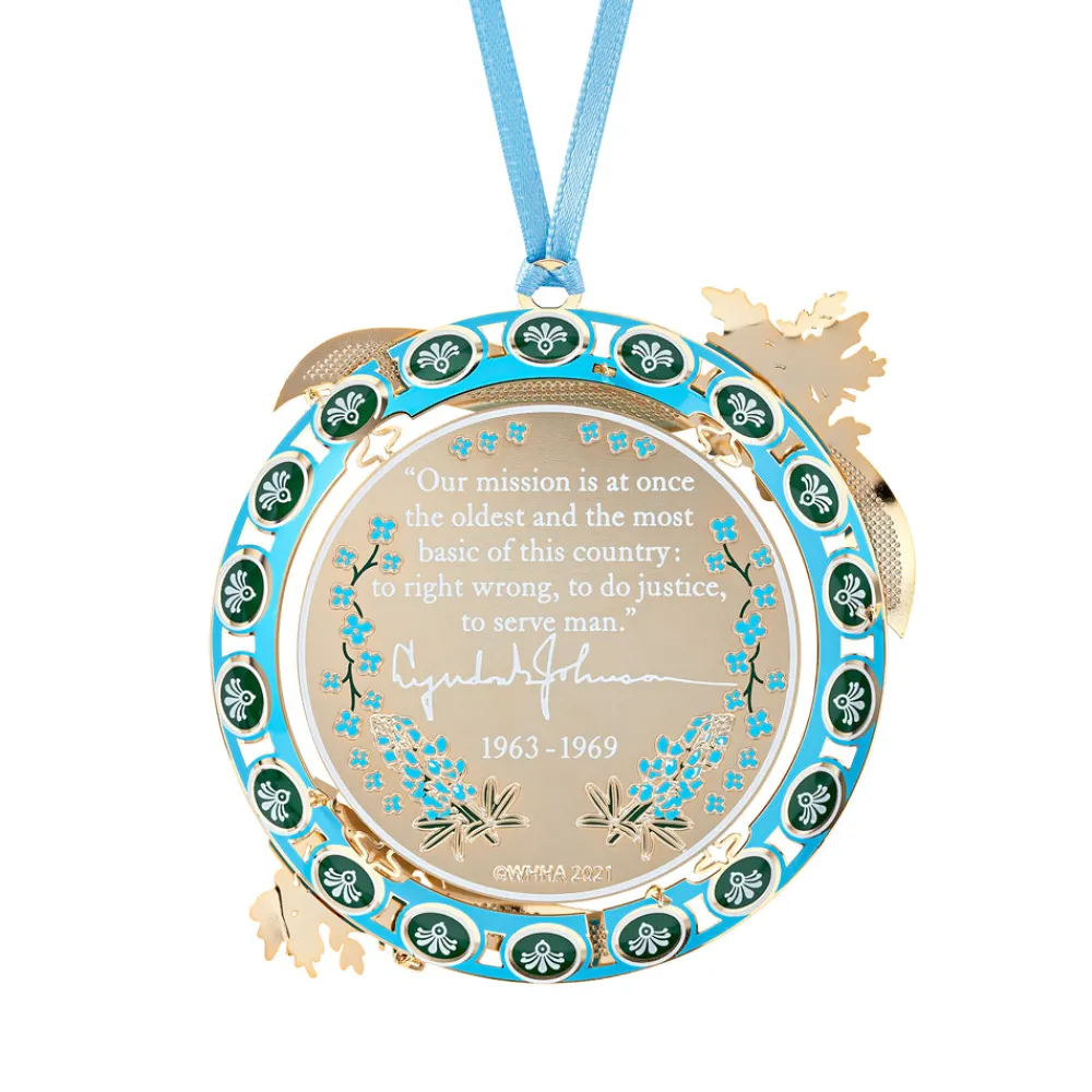 The White House Historical Association’s 2021 Official White House Christmas Ornament commemorates the presidency of Lyndon Baines Johnson. One side of the ornament features a painting of the 1967 Blue Room Christmas Tree. Mrs. Johnson requested that Robert H. Laessig, a designer for American Greetings, paint the official Christmas tree in the Blue Room for their card that year. The 1967 White House Christmas card was sent out by President and Mrs. Johnson to White House staff members, family, and friends.