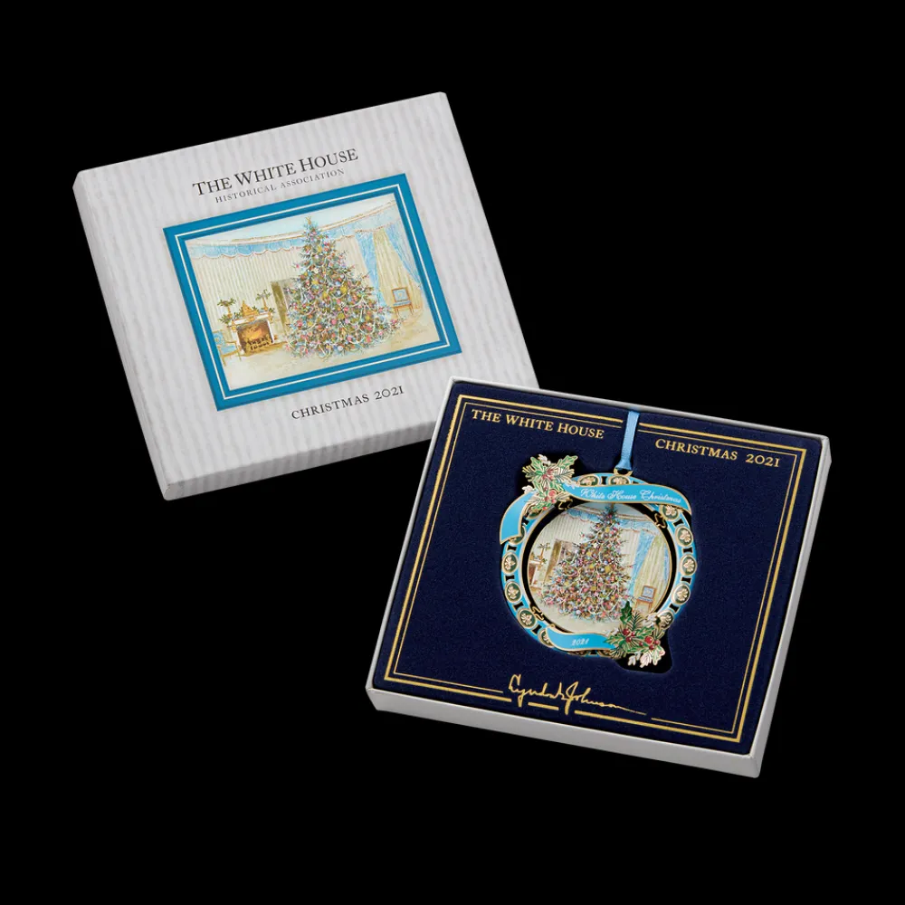 2021 Ornament: The White House Historical Association’s 2021 Official White House Christmas Ornament commemorates the presidency of Lyndon Baines Johnson. One side of the ornament features a painting of the 1967 Blue Room Christmas Tree.