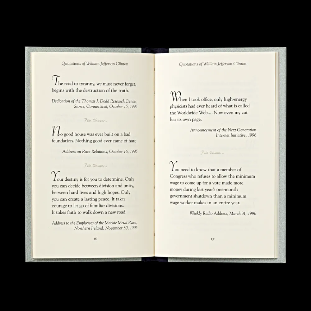 Book featuring around 100 of the most memorable statements about freedom, faith, war, government, and politics spoken by William Jefferson Clinton.