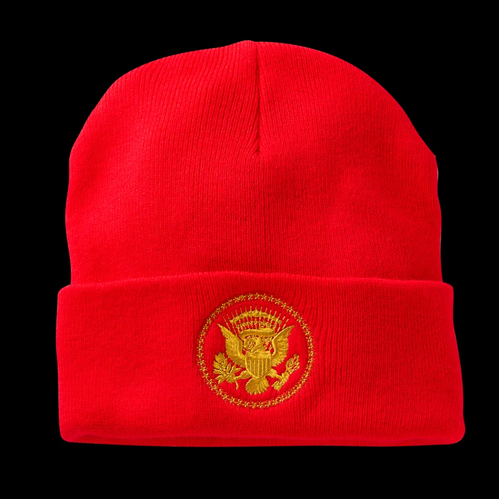 Made In The USA100% Acrylic Knit Size One size fits mostThis red knit beanie features the historic Truman Seal in gold m…