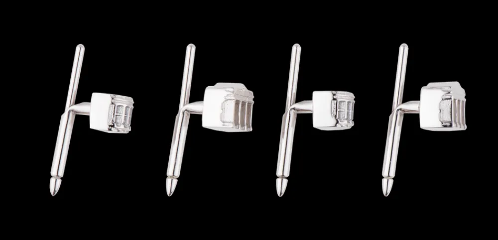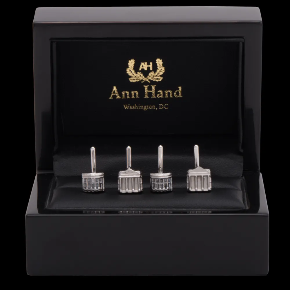 Created by American Artist Ann Hand of Washington, D.C., these elegant sterling silver White House tuxedo studs depict the north and south portico of the White House. A celebrated artist, Hand has combined her knowledge of Hollywood designers and observations of the dedication of leaders in Washington, D.C., to create her one-of-a-kind jewelry. She works in gold and silver and her jewelry has been worn by an array of clients, including first ladies, ambassadors, congresswomen, and young military wives.