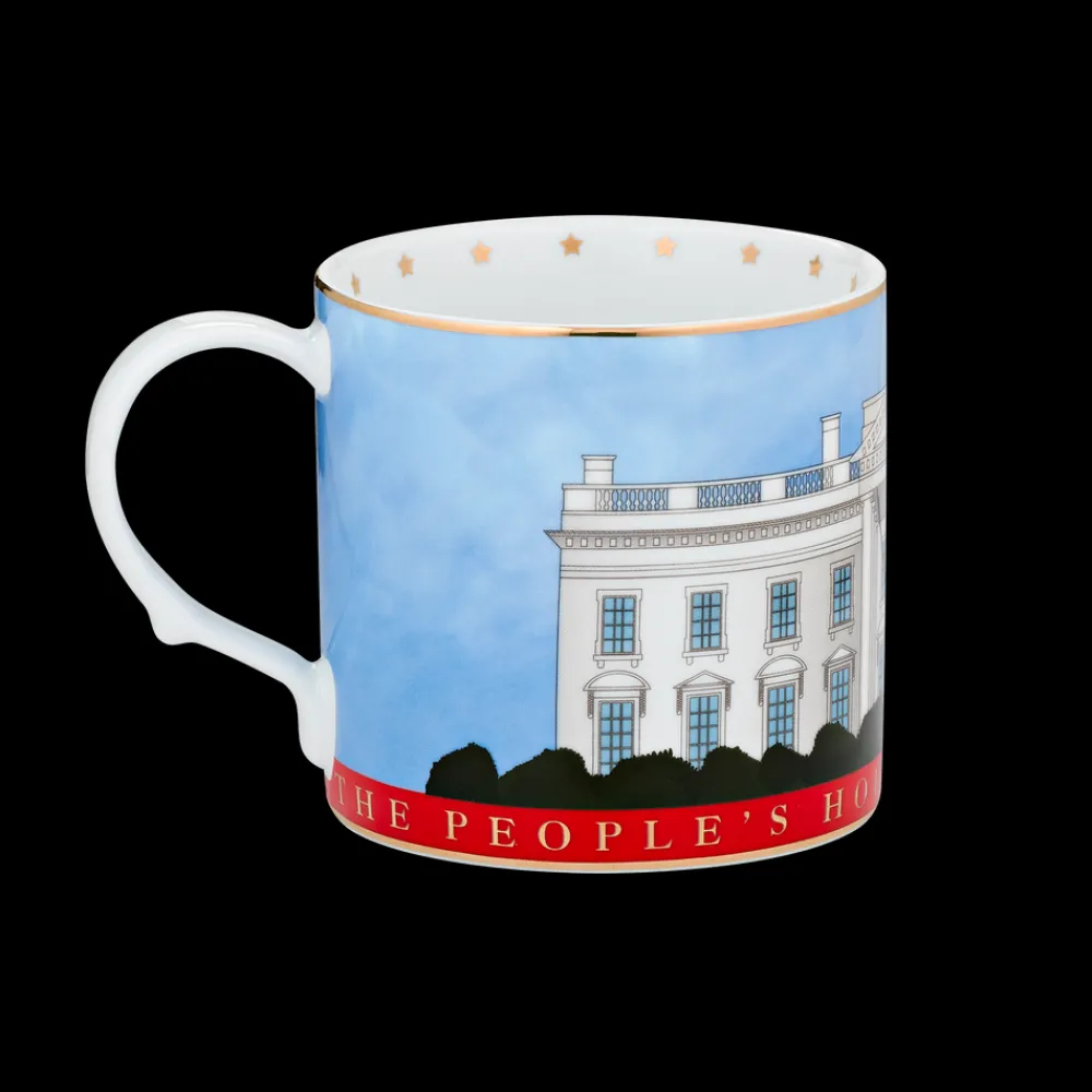 The elegant 12 ounce porcelain mug features a watercolor illustration of The White House. Adorned with gold foil details along the rim and handle, it reads “THE PEOPLE’S HOUSE. THE WHITE HOUSE.” along the base of the mug in foil lettering. Mug comes in a giftable, decorative box. Not microwave safe.