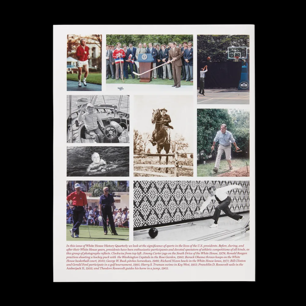 This issue looks at the sports personally pursued by the presidents—before, during, and after their White House years—as well as the national pastimes they share in celebrating with the American people. “Athletics, even as mere exercise, has been a major feature of White House life from the start,” writes William Seale, editor of White House History Quarterly. “All manner of sports have appealed to the nation’s chief executives to break the physical monotony of presidential life laid before them. Ulysses S. Grant played billiards, Theodore Roosevelt took up jujitsu, and Herbert Hoover created Hoover Ball, a complicated and strenuous game, somewhat obscure yet still played today. Fishing and golf have been a primary distractions for many, including Dwight D. Eisenhower. And presidents have long paid attention to spectator sports, too, first to baseball, then to football—specially favored by Theodore Roosevelt, as this issue reveals. Winning teams and heroes in all kinds of competitions are now honored by invitations to the White House.”