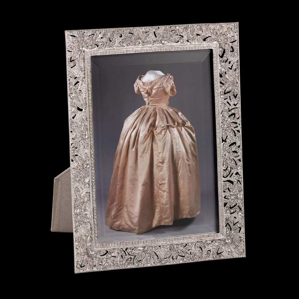 This elegant silver frame, adorned with European crystals, moire silk, and beveled glass will add a unique Victorian flare to any home.