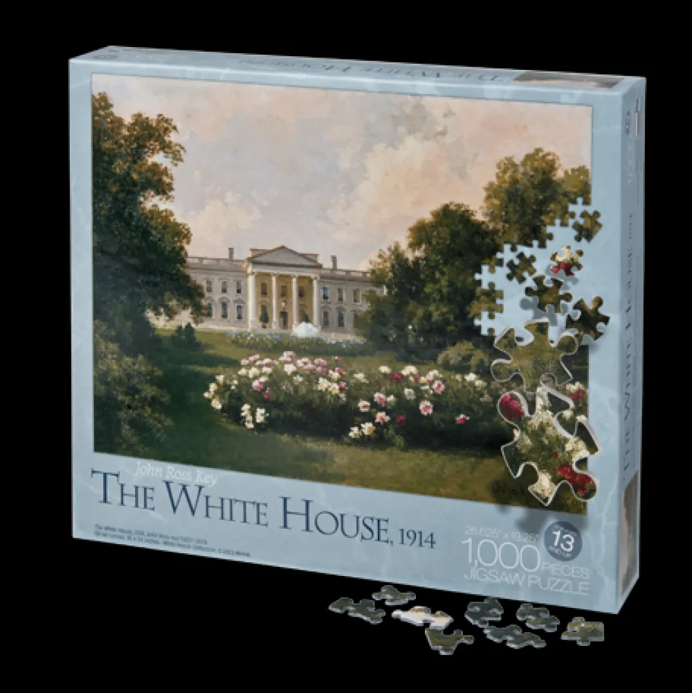 Featured on this new jigsaw puzzle is a reproduction of The White House, a 1914 painting by John Ross Key, grandson of Francis Scott Key. The painting captures a view of the North side of the White House as seen from Pennsylvania Avenue over a row of peonies in full bloom.