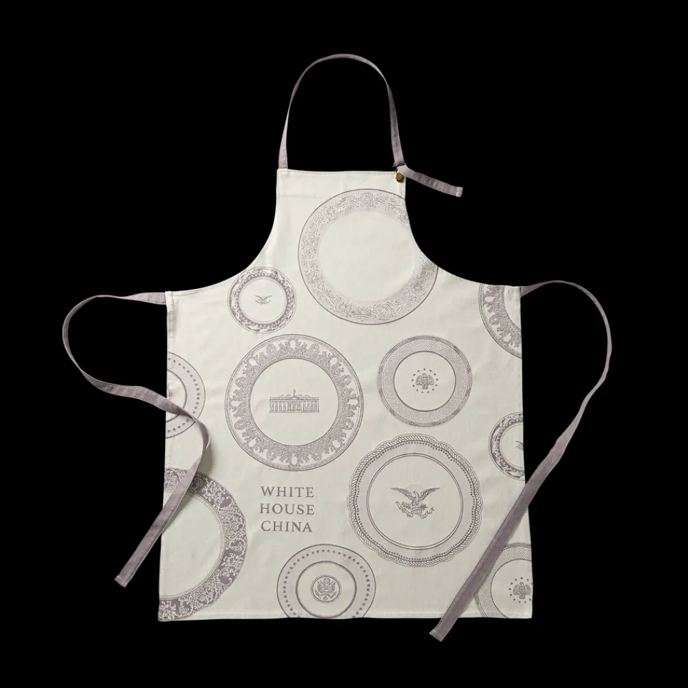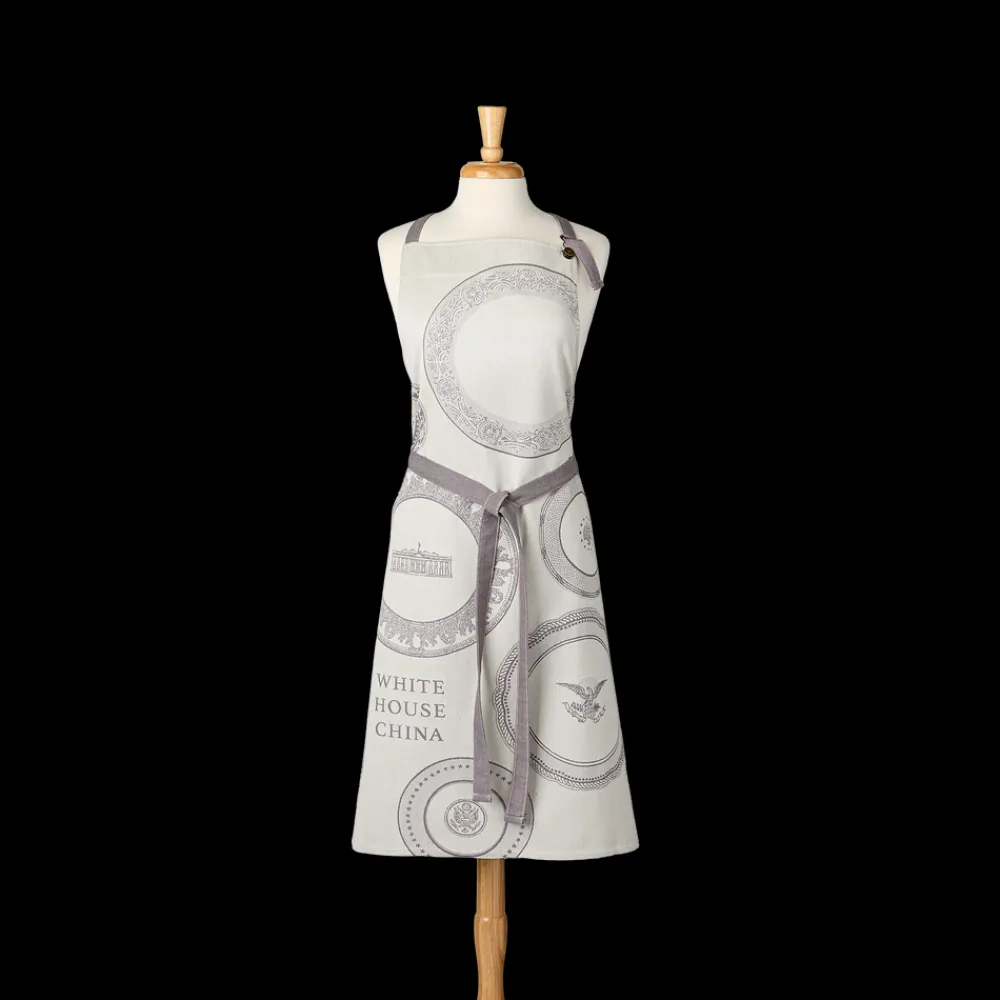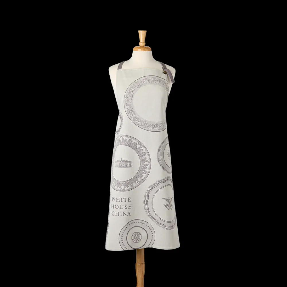 Our apron features Official White House China dinner plates from various presidencies, including Abraham Lincoln, Benjamin Harrison, William McKinley, Franklin Roosevelt, Bill Clinton, George W. Bush, and Barack Obama.