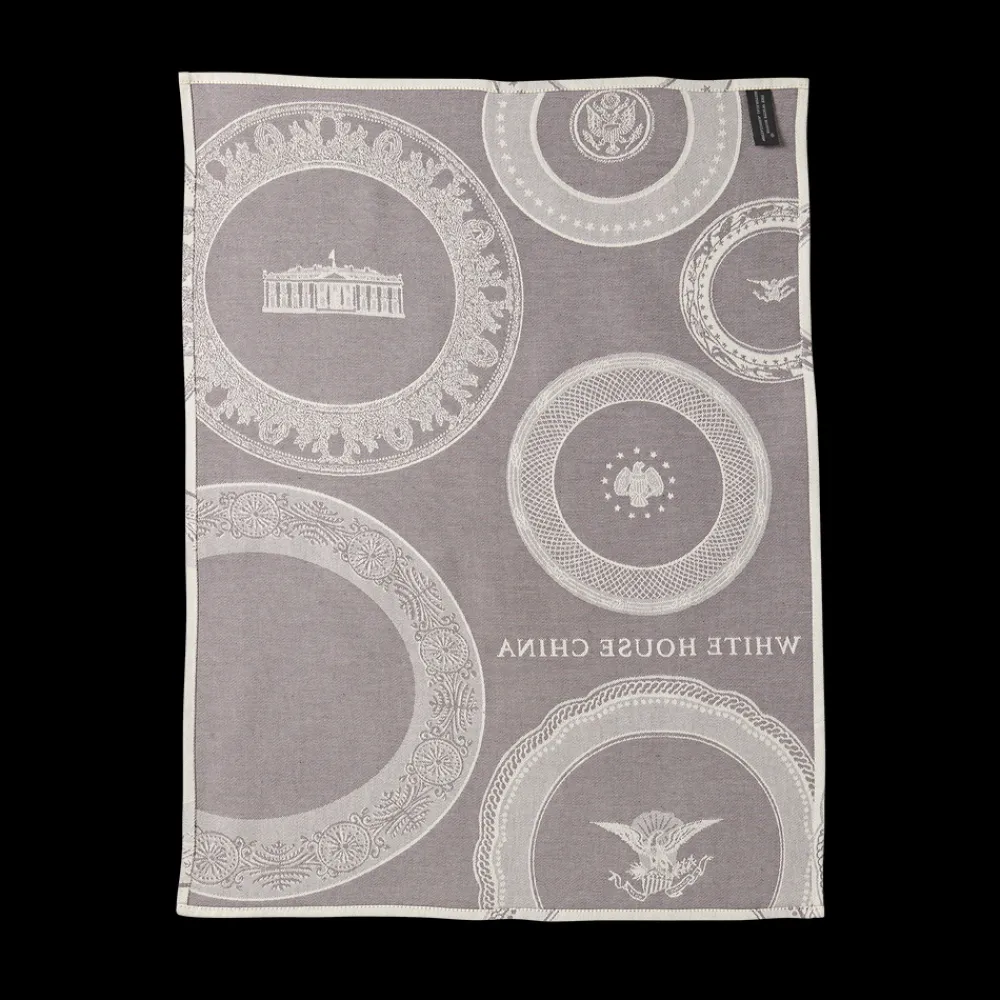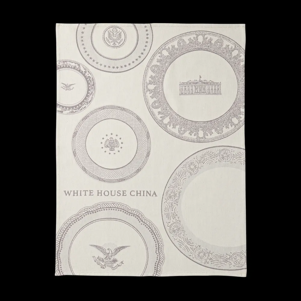 This unique tea towel features Official White House China dinner plates from various presidencies.