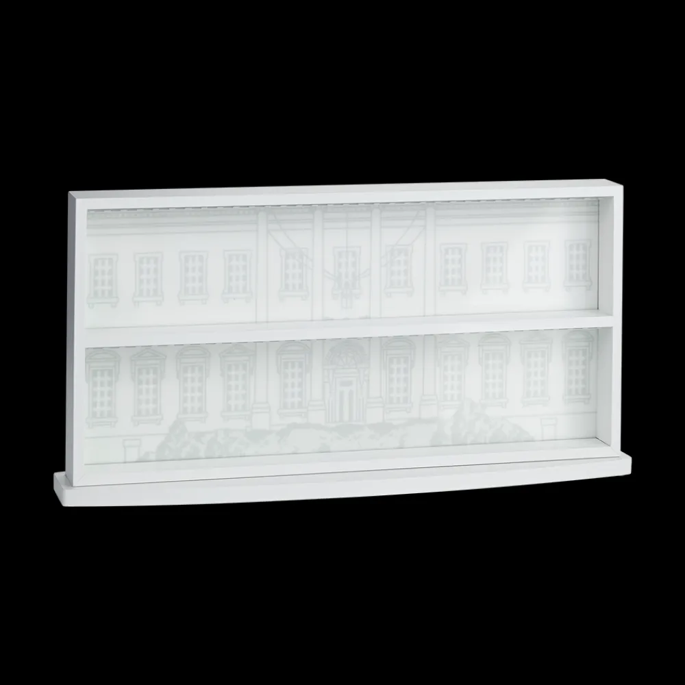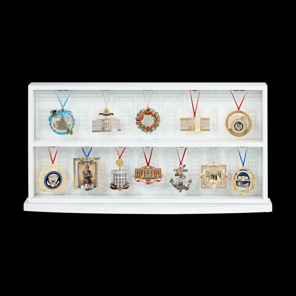 NOW 20% OFF FOR THE HOLIDAYS! Present your collection of Official White House Christmas Ornaments in style with our first ever White House Christmas Ornament display case. Each case comes with 15 red satin ribbons for an exquisite presentation. Back of the fixture has thoughtful mounting slots for balanced hanging. Some assembly required.