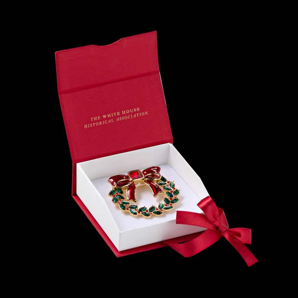 A holiday wreath cast in pewter and gold-plated, this festive brooch is inspired by traditional White House Christmas decorations displayed on the windows and doors of the Executive Mansion.