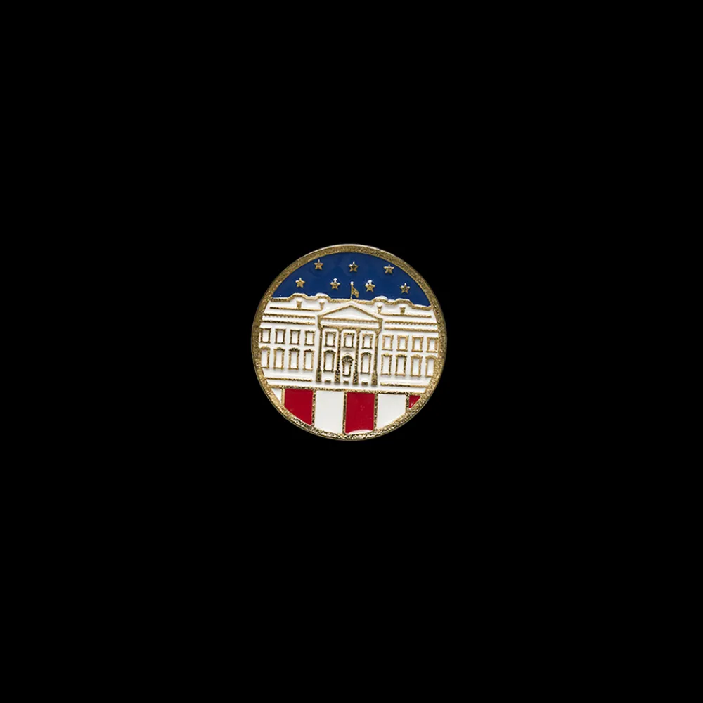 Stylized depiction of the White House and USA Flag on lapel pin. Comes mounted on cardstock.