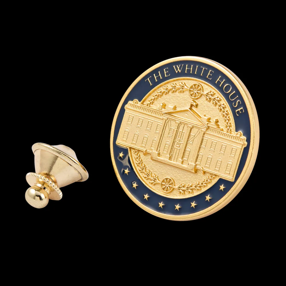 Our lapel pin captures the beauty of the North Portico of the White House with gold and navy enamel. It is crafted with a deluxe clutch backing for secure wear with this timeless accessory.