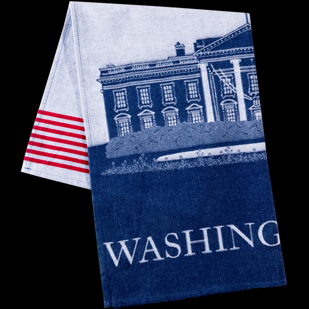 This classic tea towel has an embroidered rendering of the North Portico of the White House.