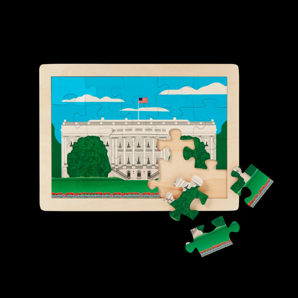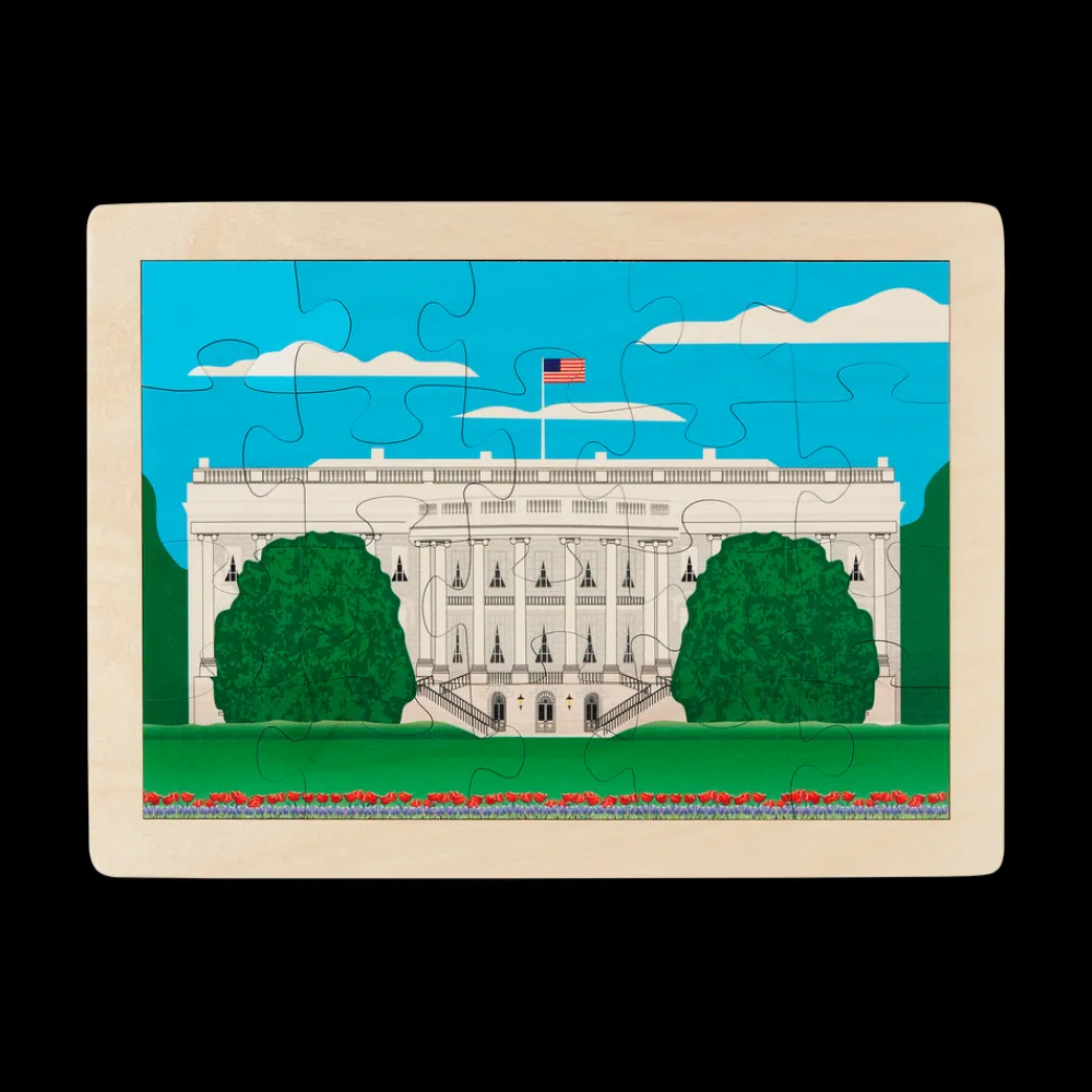 Explore the unique architecture of the White House while assembling this wooden puzzle of the South Portico grounds of the President’s House. Created for ages 3+ and inscribed with White House history for your little one to absorb. <