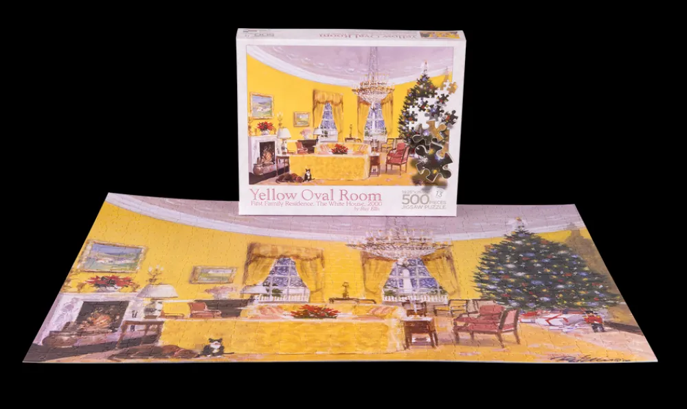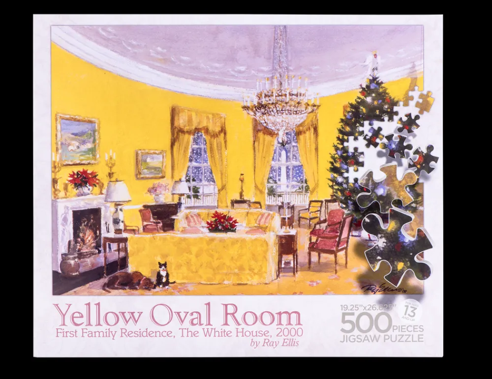 This 500 piece puzzle is based on a watercolor by Ray Ellis titled The Yellow Oval Room, First Family Residence, The White House, 2000. It depicts the Yellow Oval Room during the administration of President William J. Clinton decorated for Christmas. Buddy and Socks, the Clinton family pets, are shown at left in front of the sofa. This painting is part of the White House Collection at the White House Historical Association. Made in the U.S.A.